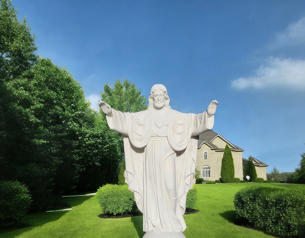 Crafted from pure white marble, this sacred Jesus statue depicts Christ with open arms, symbolizing love and compassion. Ideal for church grounds, private religious gardens, and memorial sites, it offers timeless elegance and durable outdoor performance. Fully customizable in size and finish.