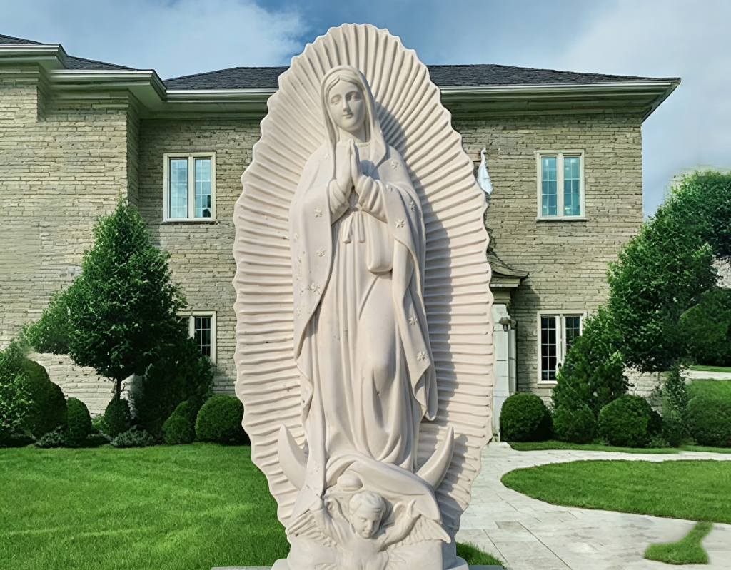This hand-carved white marble statue of Our Lady of Guadalupe features intricate detailing and a radiant halo, perfect for Catholic churches, shrines, and devotional gardens. Weather-resistant and long-lasting, it can be customized to match your religious site’s scale and aesthetic.