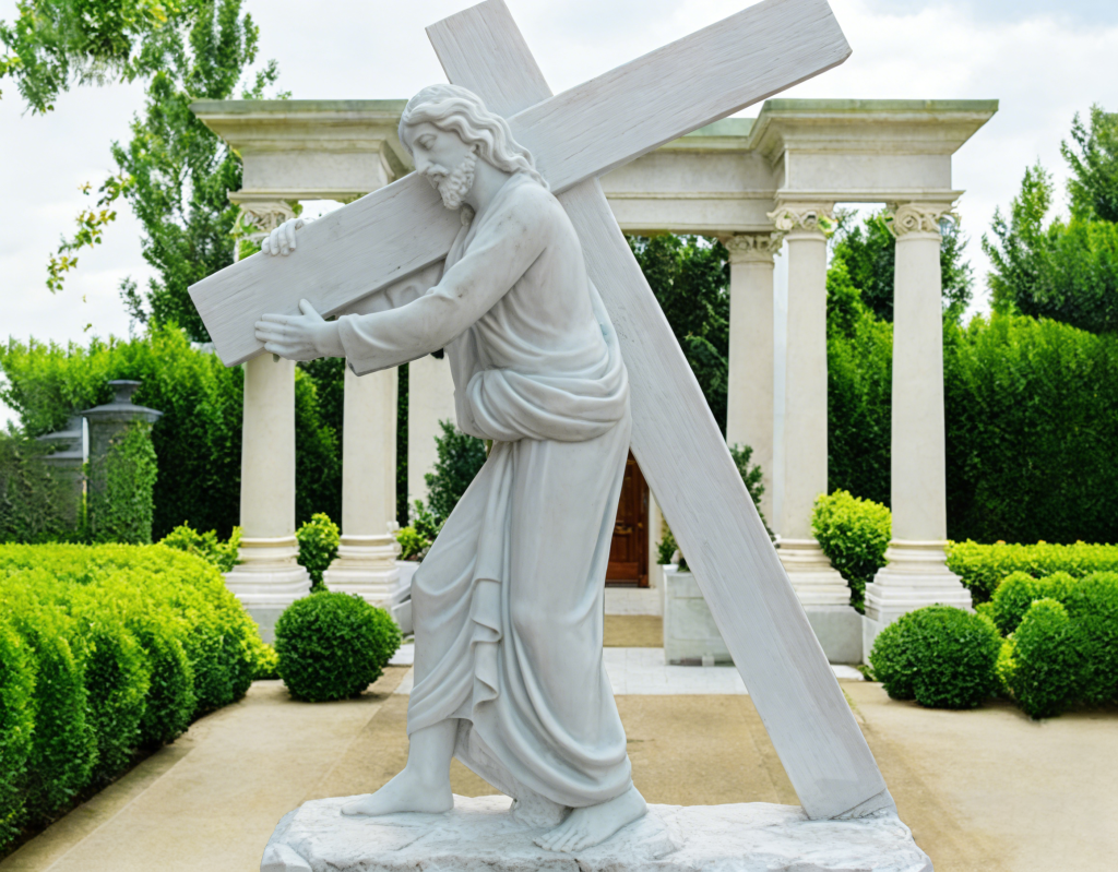Crafted from white marble, this statue shows Jesus bearing the cross, symbolizing sacrifice and faith. Perfect for church grounds, memorial gardens, and Catholic devotional sites, it is durable for outdoor use and fully customizable in size.