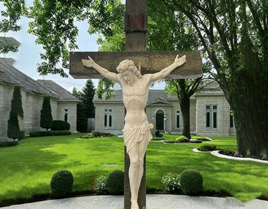 This sacred marble crucifix depicts Jesus on the cross, embodying redemption and hope. Ideal for church memorials, cemetery sites, and religious gardens, it is weather-resistant and fully customizable in size and finish.