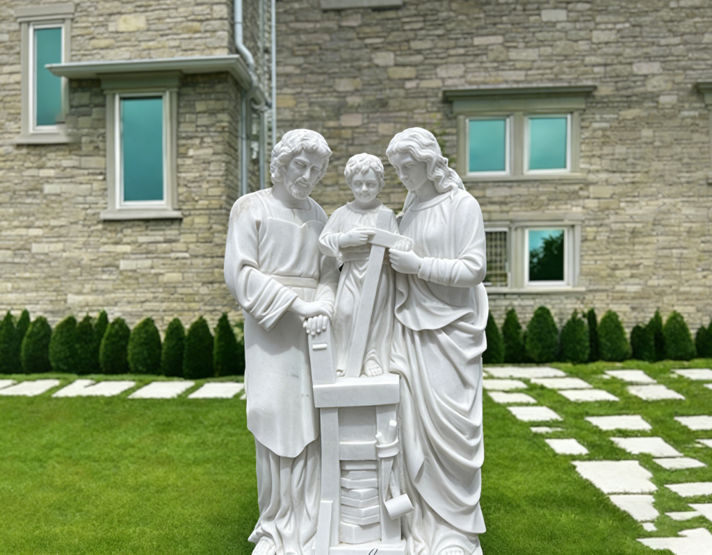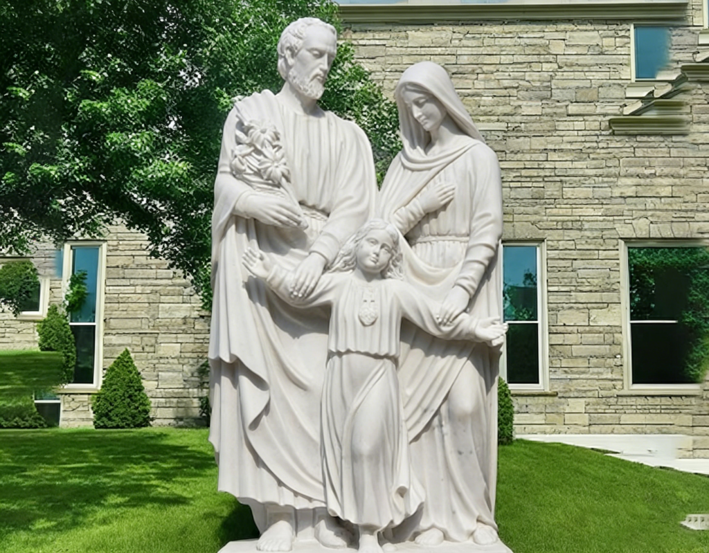 This sacred white marble sculpture depicts the Holy Family—Joseph, Mary, and the child Jesus—holding a small child. Ideal for church grounds, religious family gardens, and memorial sites, it embodies love, unity, and timeless faith. Crafted from durable marble, it is fully customizable in size and finish.