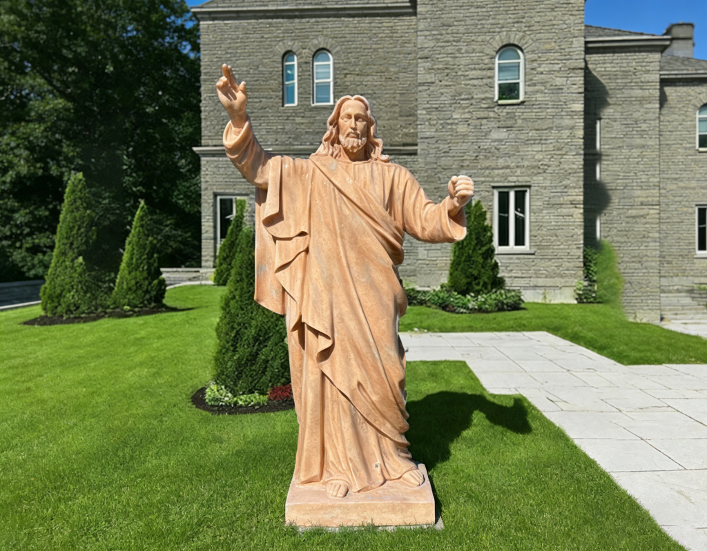 Crafted from warm-toned marble, this sacred Jesus statue features Christ with one hand raised in blessing, symbolizing compassion and guidance. Perfect for church entrances, prayer gardens, and Catholic devotional spaces, it offers a serene, uplifting presence. Weather-resistant and fully customizable in scale and material.