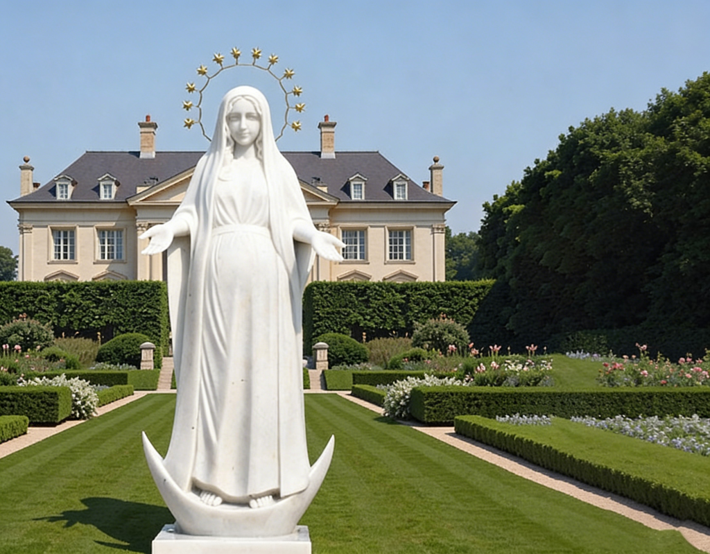 This sacred white marble statue of the Virgin Mary stands on a crescent moon base, crowned with a golden star halo. Ideal for church grounds and devotional gardens, it symbolizes purity and divine grace. Durable outdoor performance, fully customizable in size and finish.